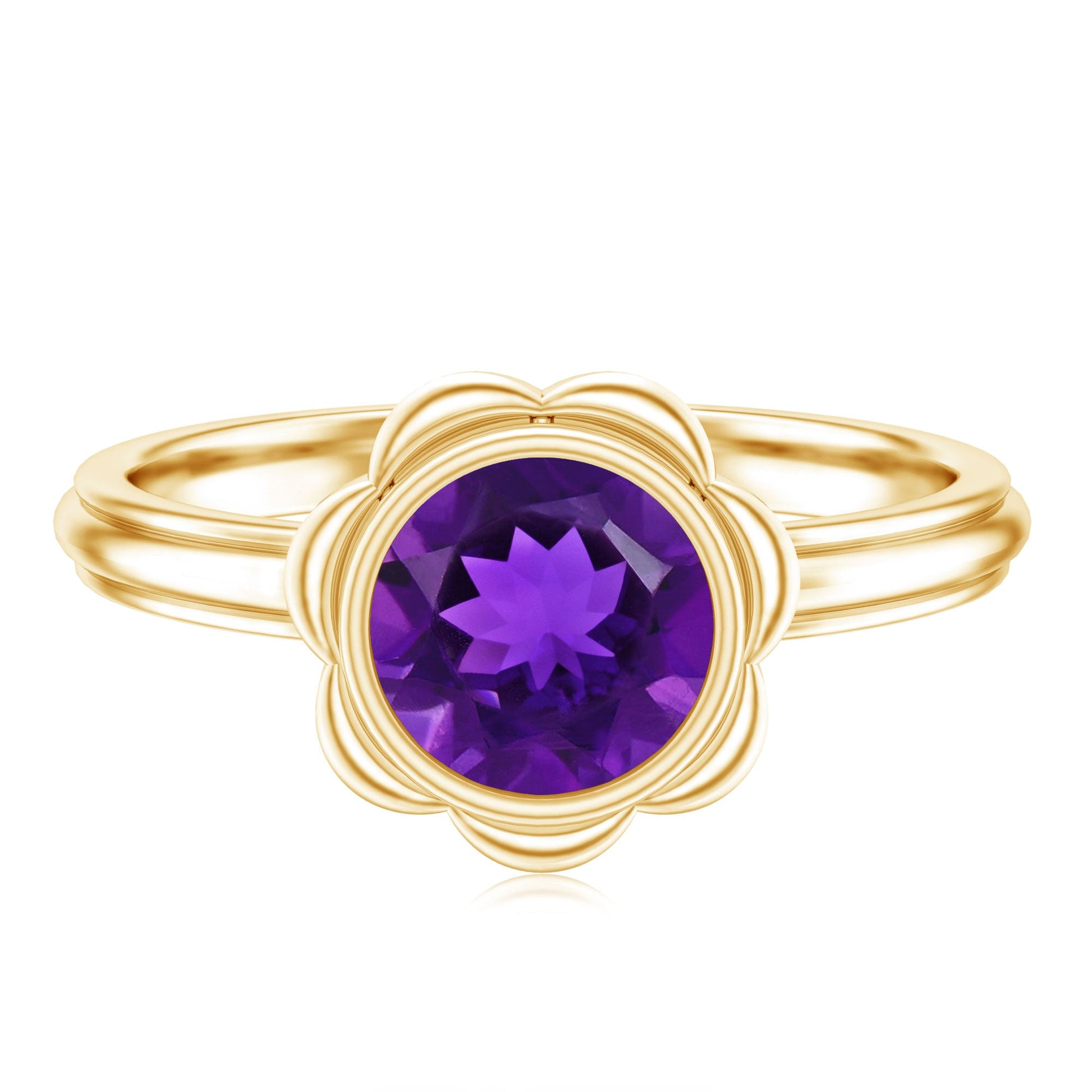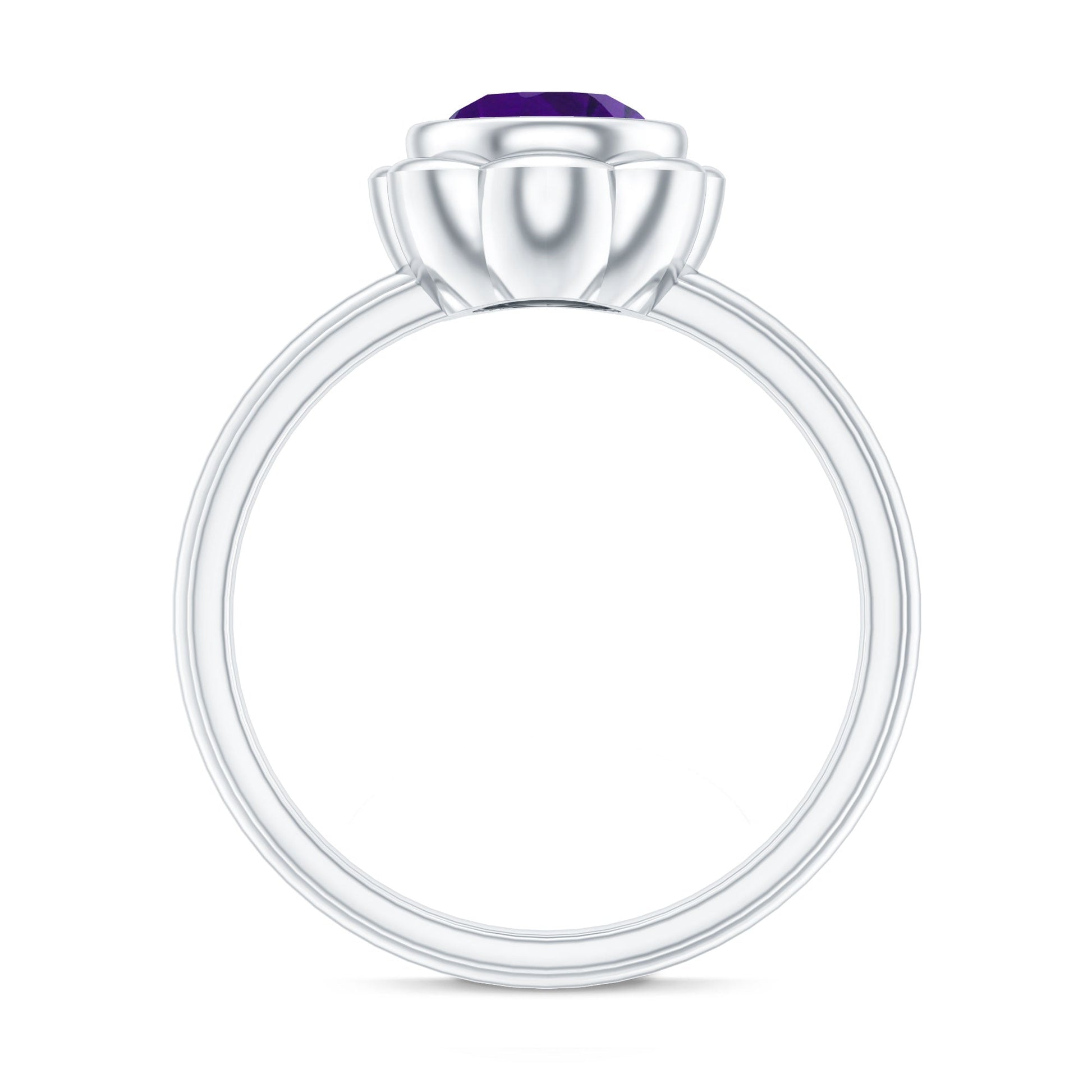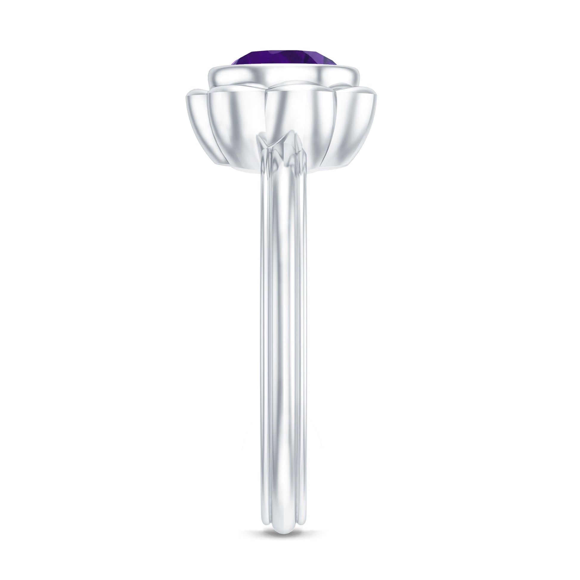 Rosec jewels nature inspired Amethyst Ring is designed to feel both graceful and meaningful. Curated with a beautifully cut 7 MM round amethyst, admired for its rich purple tone that symbolizes calm, clarity, and emotional balance. As the February birthstone, amethyst adds a personal touch, making the Solitaire Engagement Ring especially thoughtful for birthdays, milestones, or heartfelt gifting. The gemstone is secured in bezel setting that gently frames the stone while offering a modern and protective design suited for everyday wear. Surrounding the stone are petal details that form a subtle floral motif. Known for its durability and timeless appeal, amethyst brings a sense of warmth and individuality to the design. This Amethyst Engagement Ring arrives in a thoughtfully designed jewelry box and includes a certificate of authenticity for peace of mind. Designed to feel personal and lasting, it is a piece meant to be cherished for years to come. Available in a range of US ring sizes from 3 to 13, this Amethyst Flower Ring is something you will never want to take off.