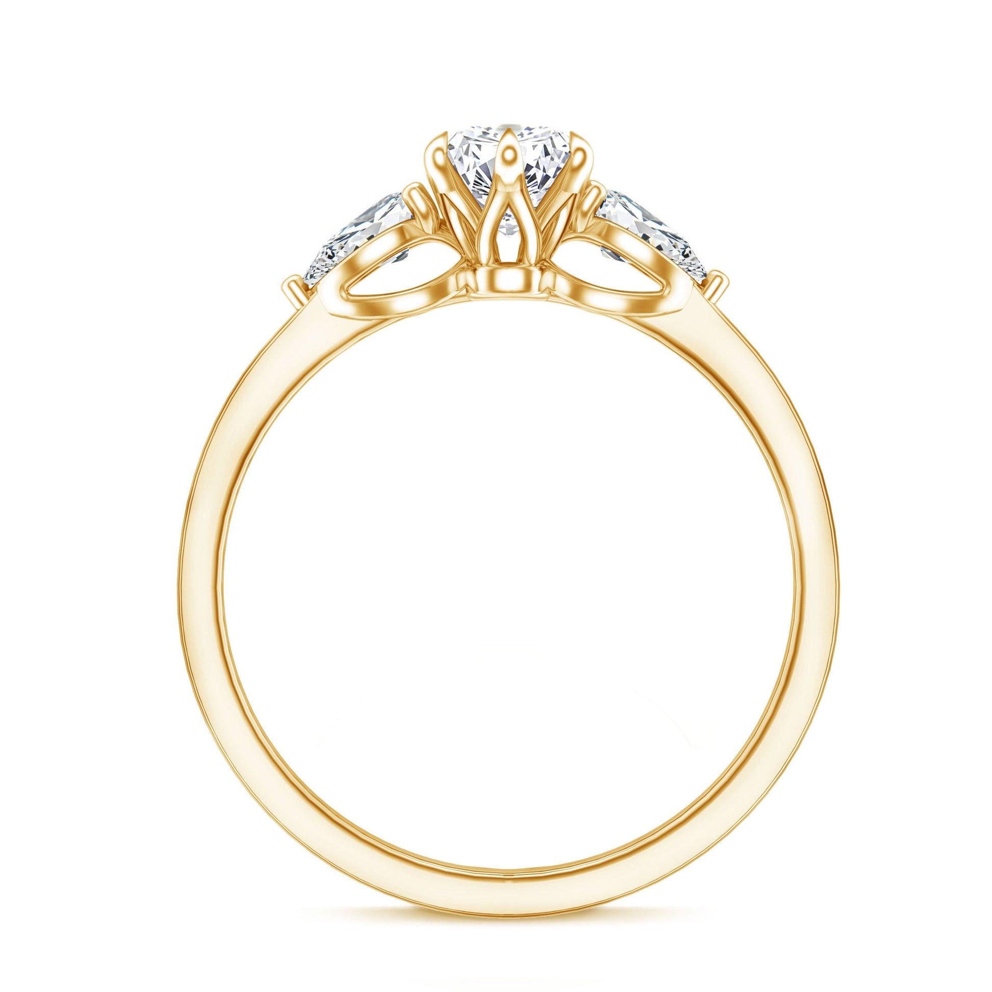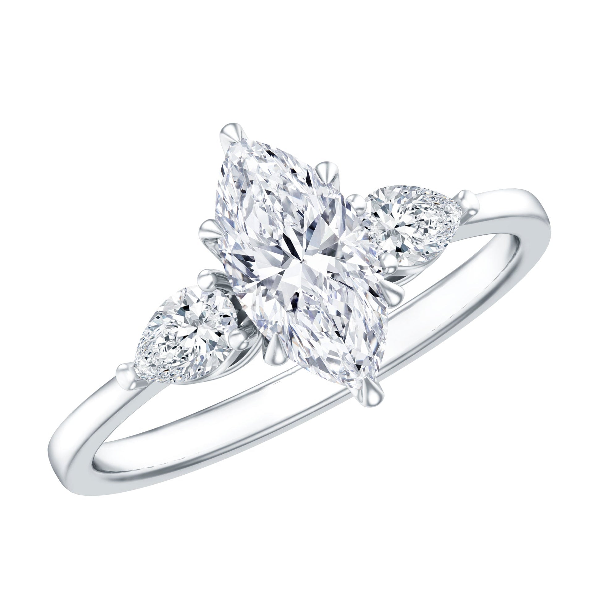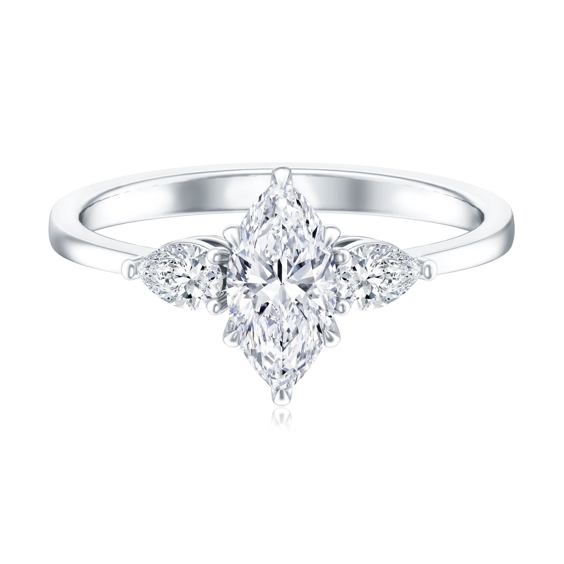 Love feels even more powerful when it is captured in a ring that tells a story. This Lab Created Diamond Engagement Ring features a striking 5X10 MM marquise cut lab grown diamond graded EF-VS quality, glowing with exceptional brilliance and clarity. Held securely in claw setting, the marquise shape creates an elongated look that instantly draws attention and adds a graceful touch to the hand. Enhancing the design, two sparkling 3X5 MM pear shaped lab grown diamonds sit on either side, secured in prong setting. Together, the three stones represent the past, present, and future - making this Marquise Engagement Ring rich in meaning and emotion. The arrangement adds sparkle while keeping the overall look modern and stylish. Crafted with care and an ethical approach, this Diamond Three Stone Ring is made to last and shine through every chapter of life. Its simple band offers comfort for everyday wear while maintaining a timeless appeal. Available in sizes 3 to 13, it ensures a fit that feels just right. Presented in a beautiful jewelry box, this Past Present and Future Engagement Ring makes an unforgettable first impression and remains a lasting symbol of love, promise, and connection.