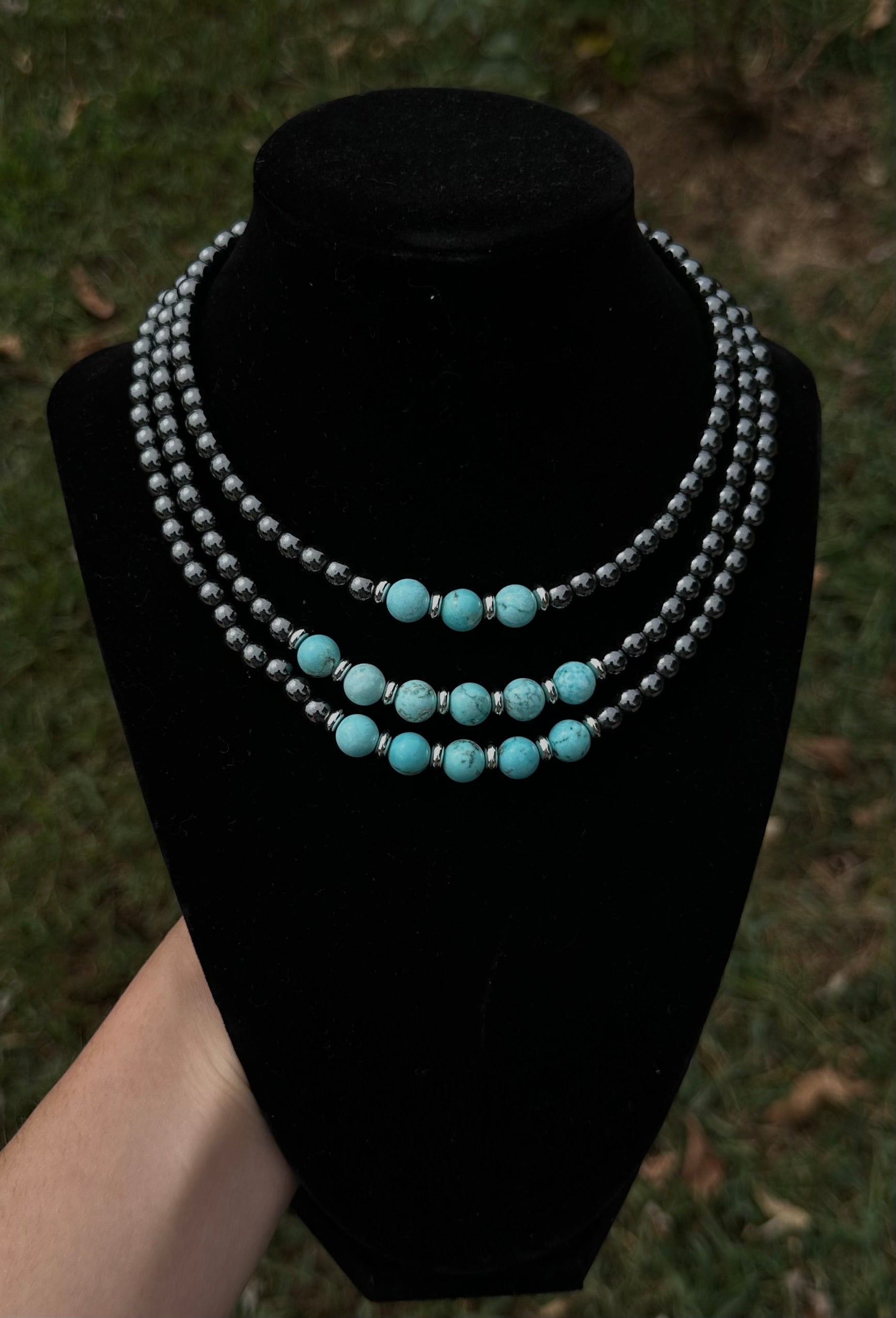 Bold, layered, and made for the trailblazer at heart — the Cowgirl’s Cascade necklace features three strands of dark silver beads, anchored with round turquoise stones along the bottom. The layered design creates a flowing, cascading effect that captures the spirit of wide-open skies and endless western horizons.