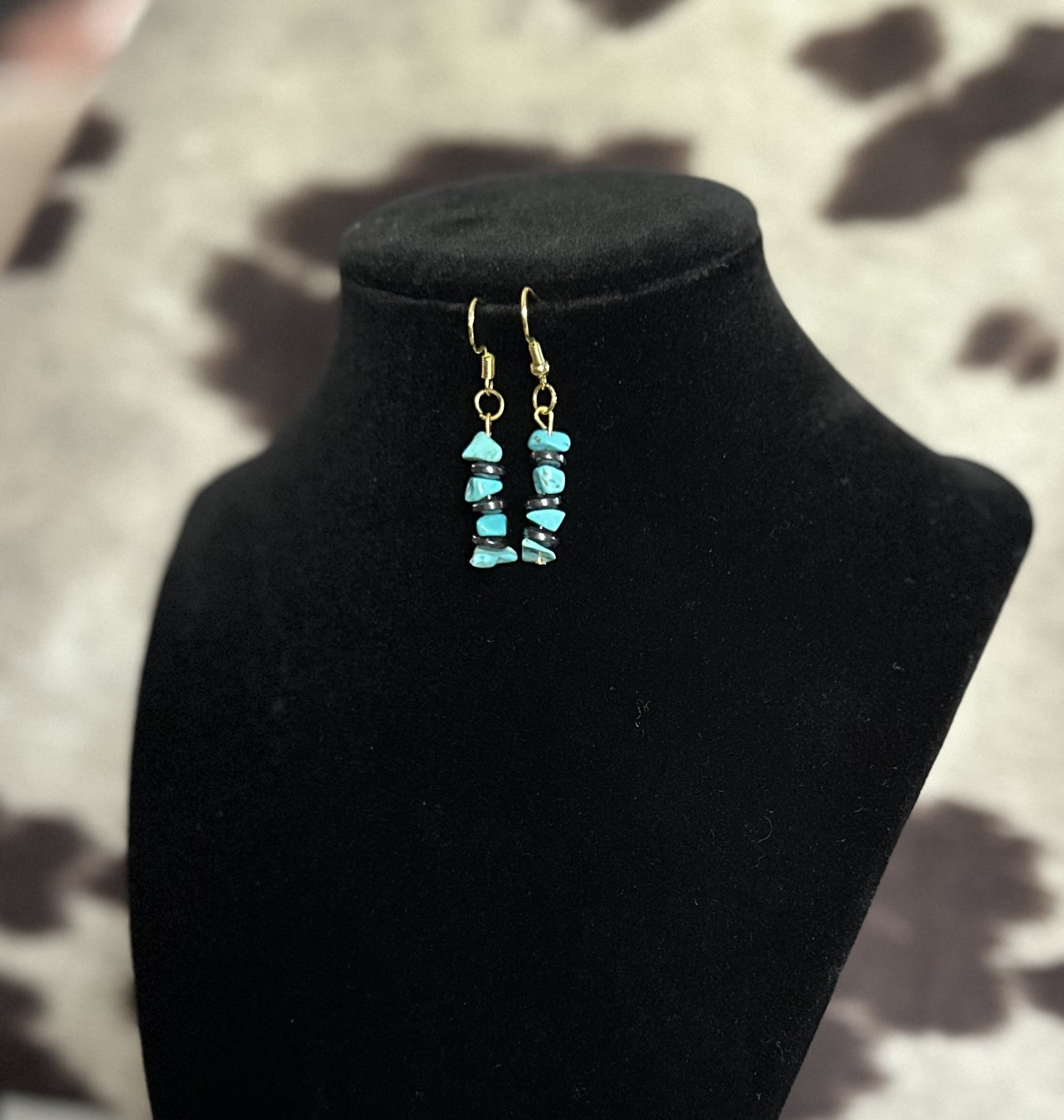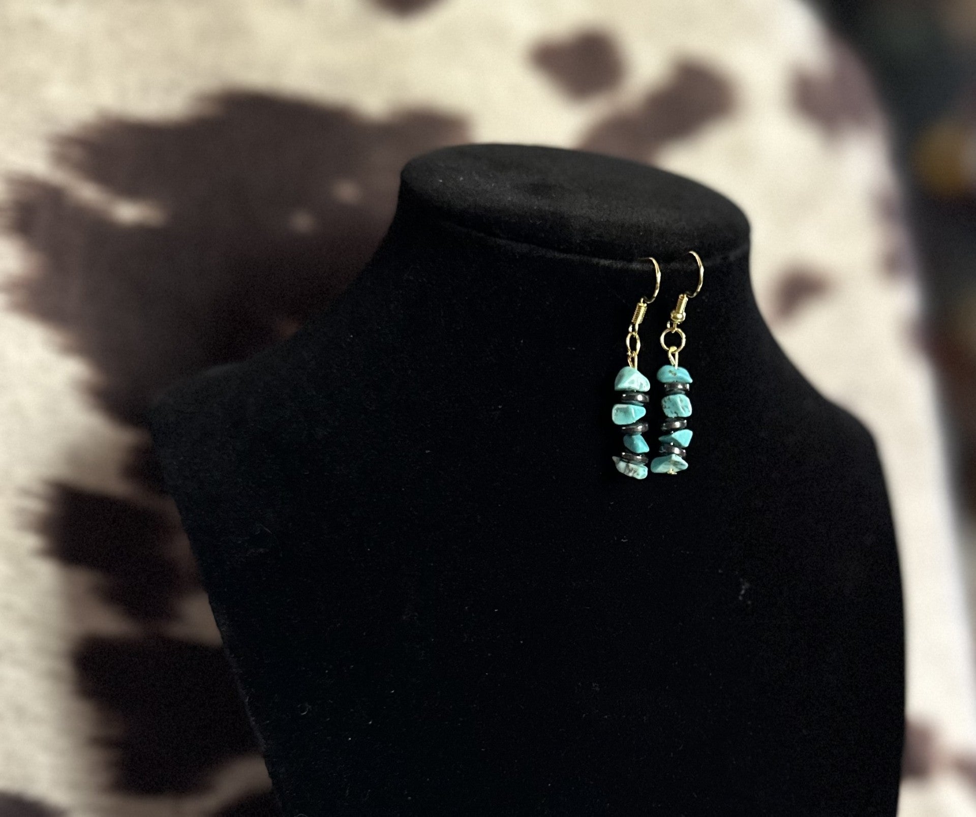 Inspired by the rugged beauty of the desert in full bloom, these Desert Bloom earrings capture the wild spirit of the Southwest. Featuring stacks of natural turquoise stones with delicate gold accents, these earrings bring a pop of color and rustic charm to any look.