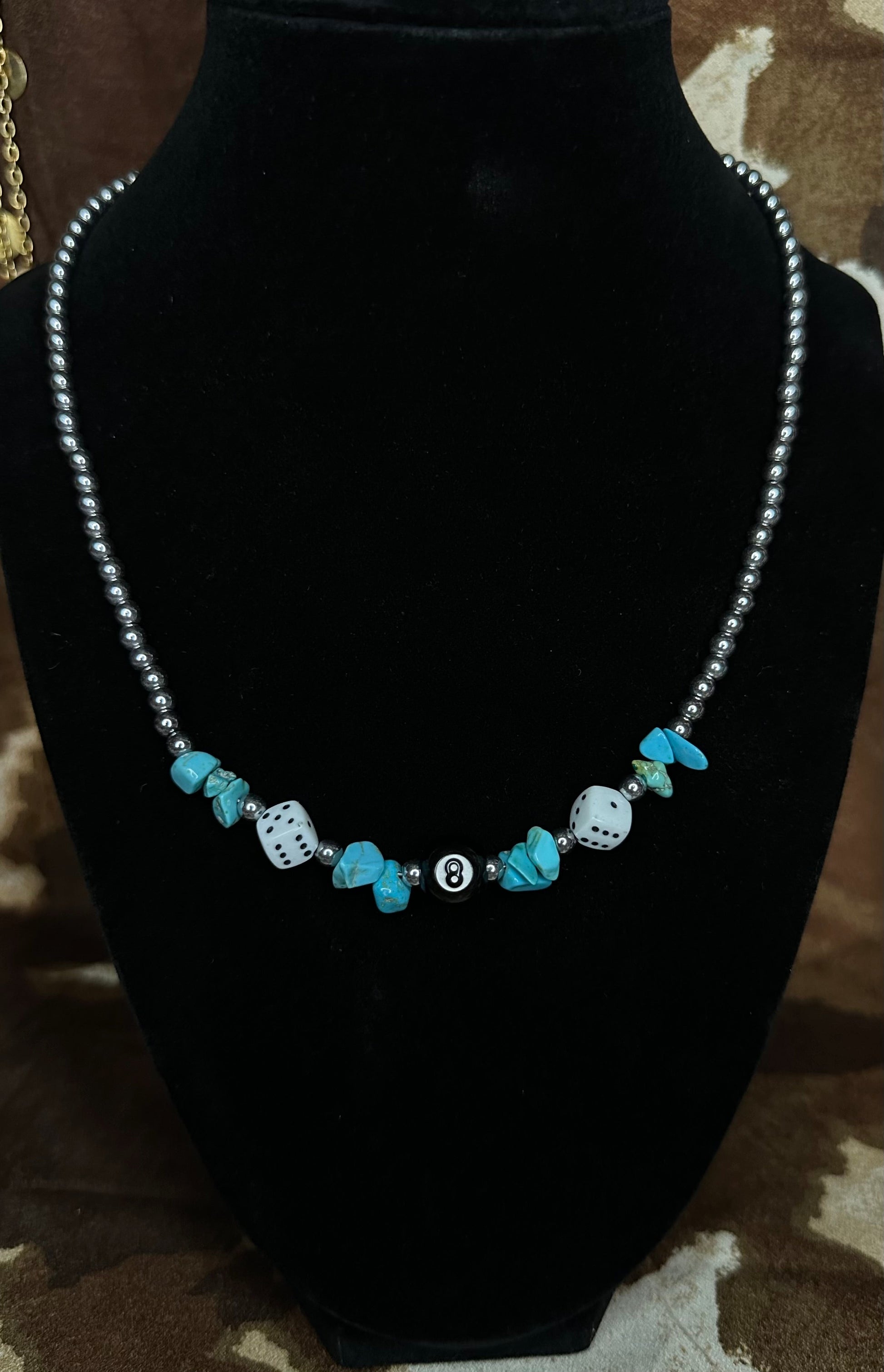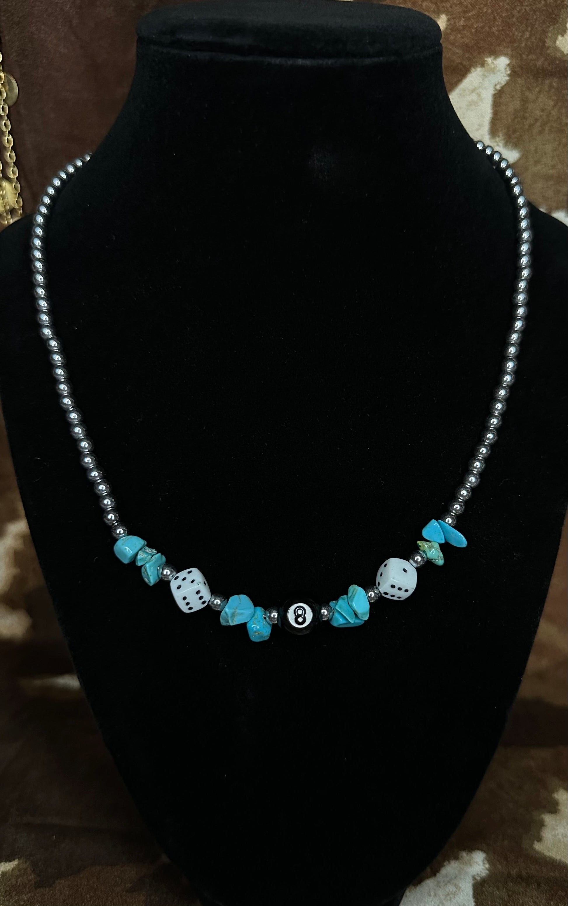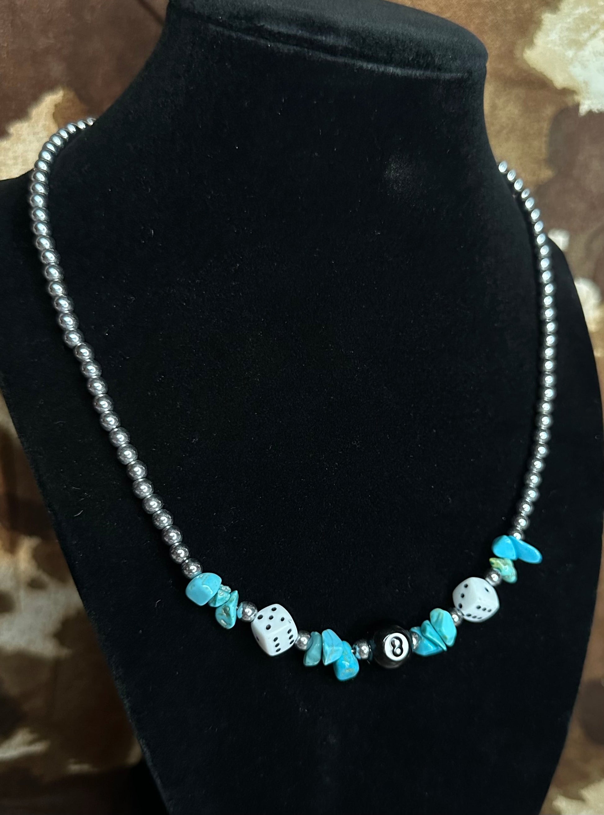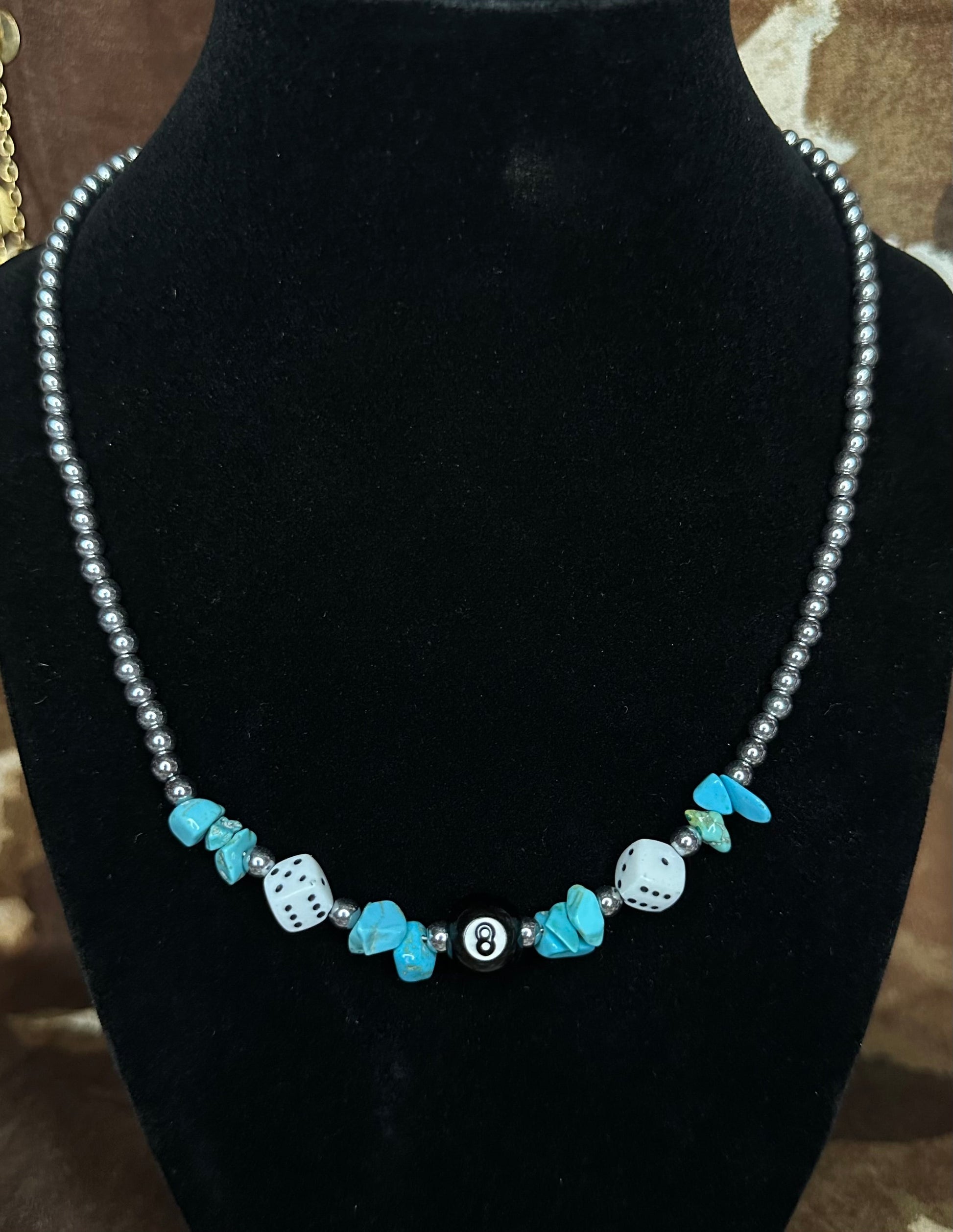 - Handmade with turquoise chip beads, silver spacers, white dice, and an 8 ball centerpiece