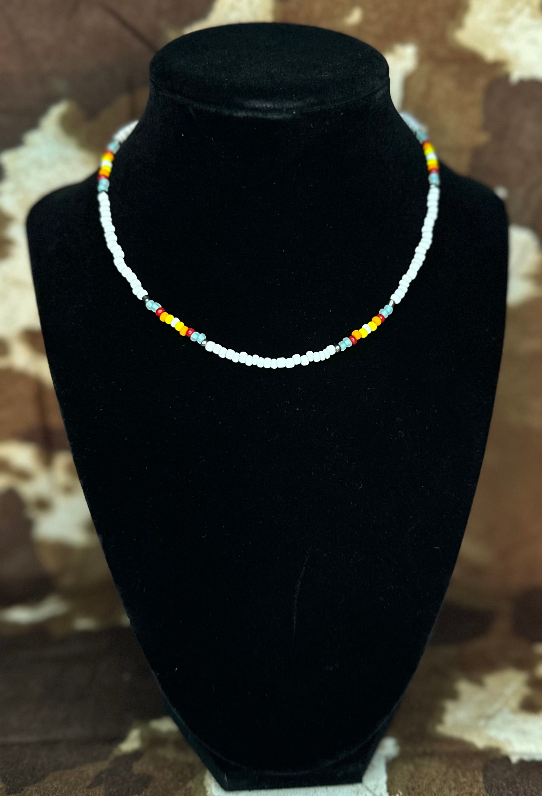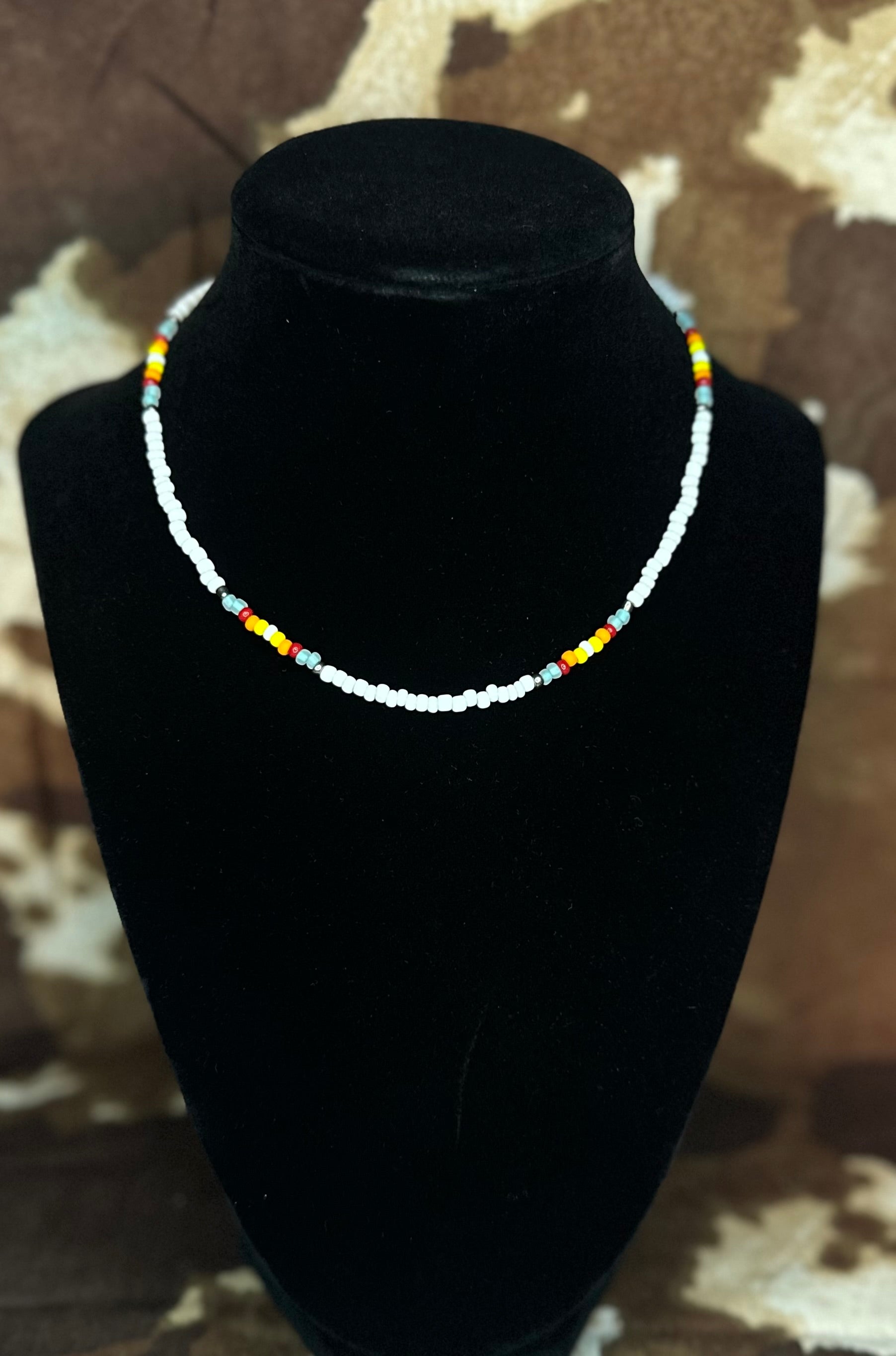 Light up your look with the Ember Glow choker, a handcrafted seed bead necklace that brings the warmth of a flickering fire to your outfit. Featuring a crisp white base accented with patterns of silver, red, orange, and yellow beads, this piece creates a vibrant, eye-catching design around your neckline. Finished with an extender chain and lobster clasp, it offers a comfortable, adjustable fit—perfect for layering or wearing solo as a statement accessory that radiates warmth and style.