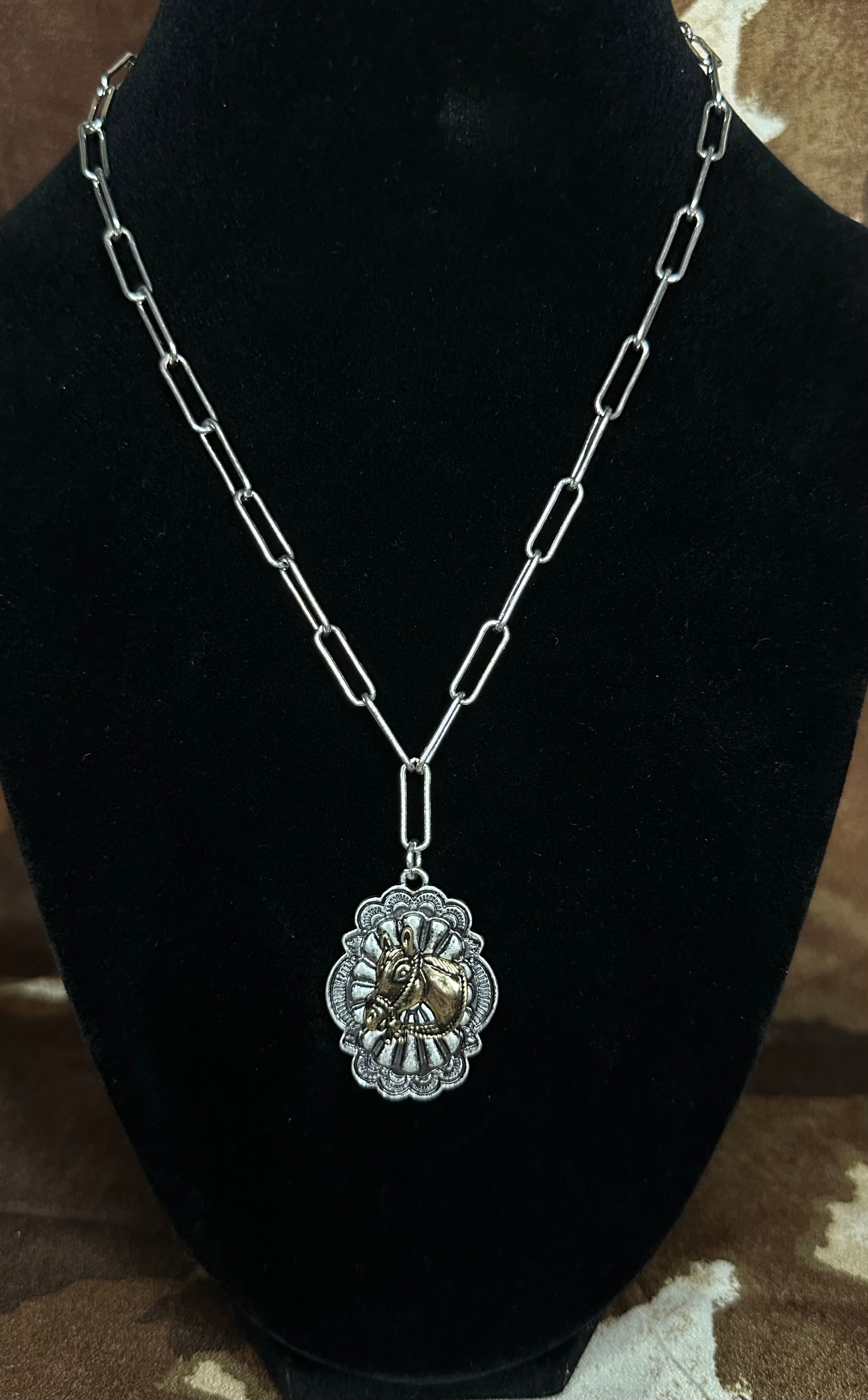 Saddle up with timeless style. This handmade necklace features a sleek silver paperclip chain secured with a sturdy silver lobster clasp, making it both durable and effortlessly chic. The star of the piece is a beautifully detailed silver and gold horse pendant, capturing the spirit of the West with a graceful, rustic flair.