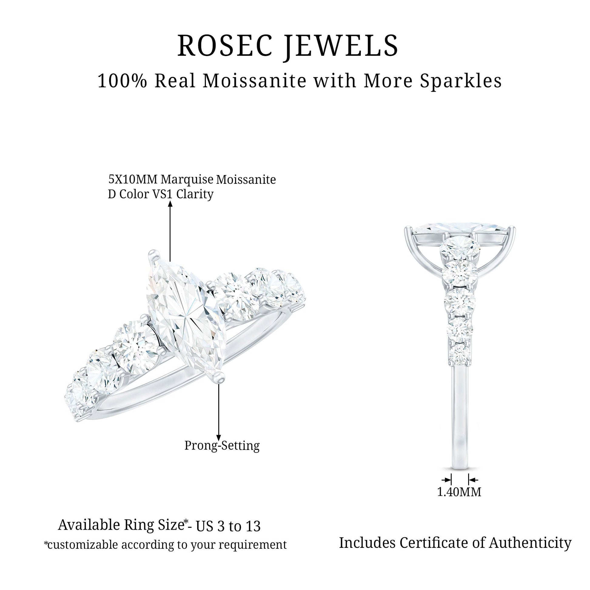 A sparkle that makes every glance feel special, this Marquise Moissanite Engagement Ring is all about that brilliance. At the center sits a beautifully cut 7X14 MM marquise shaped moissanite, secured in prong setting that lets the stone reflect maximum light. The band is lined with smaller round moissanite stones, carefully arranged in a graduated pattern to add soft shimmer. Together, they create a design that feels timeless yet modern, perfect for anyone who loves understated glamour with a hint of luxury. The band makes this Marquise Engagement Ring ideal for daily wear, whether stacked with other favorites or worn solo as a statement of love. Available in different metal options and sizes from US 3 to 13, it is thoughtfully made to fit your personal style perfectly. This Side Stone Engagement Ring comes with a certificate of authenticity, so you can treasure it with complete confidence. Whether it is for a proposal, anniversary, or a special moment, this Moissanite Ring for Women brings a sparkle that feels as endless as your love.