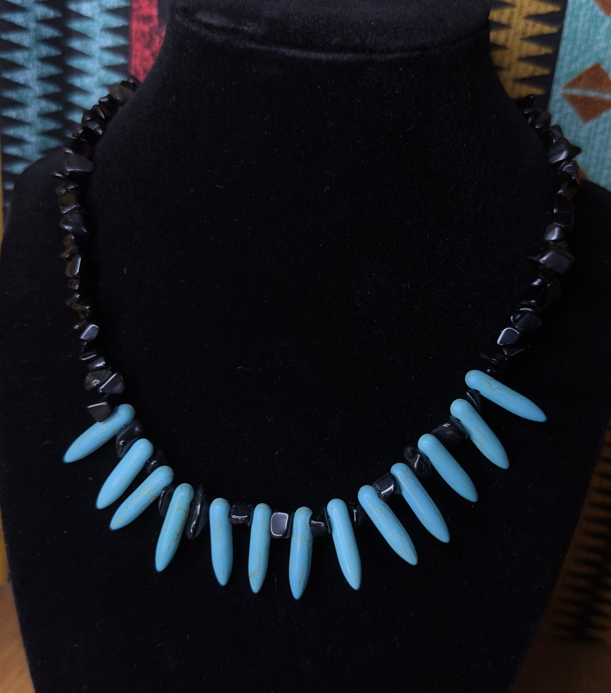 Bring bold western charm to your outfit with the Midnight Spurs necklace — a striking blend of sky-blue faux turquoise dagger beads and glossy black stone chips. Each point is spaced with deep black glass accents, giving the piece a rugged yet elegant edge. This statement necklace captures the spirit of the Southwest with a dramatic silhouette that looks stunning with denim, leather, or even dressed up for a night out.
