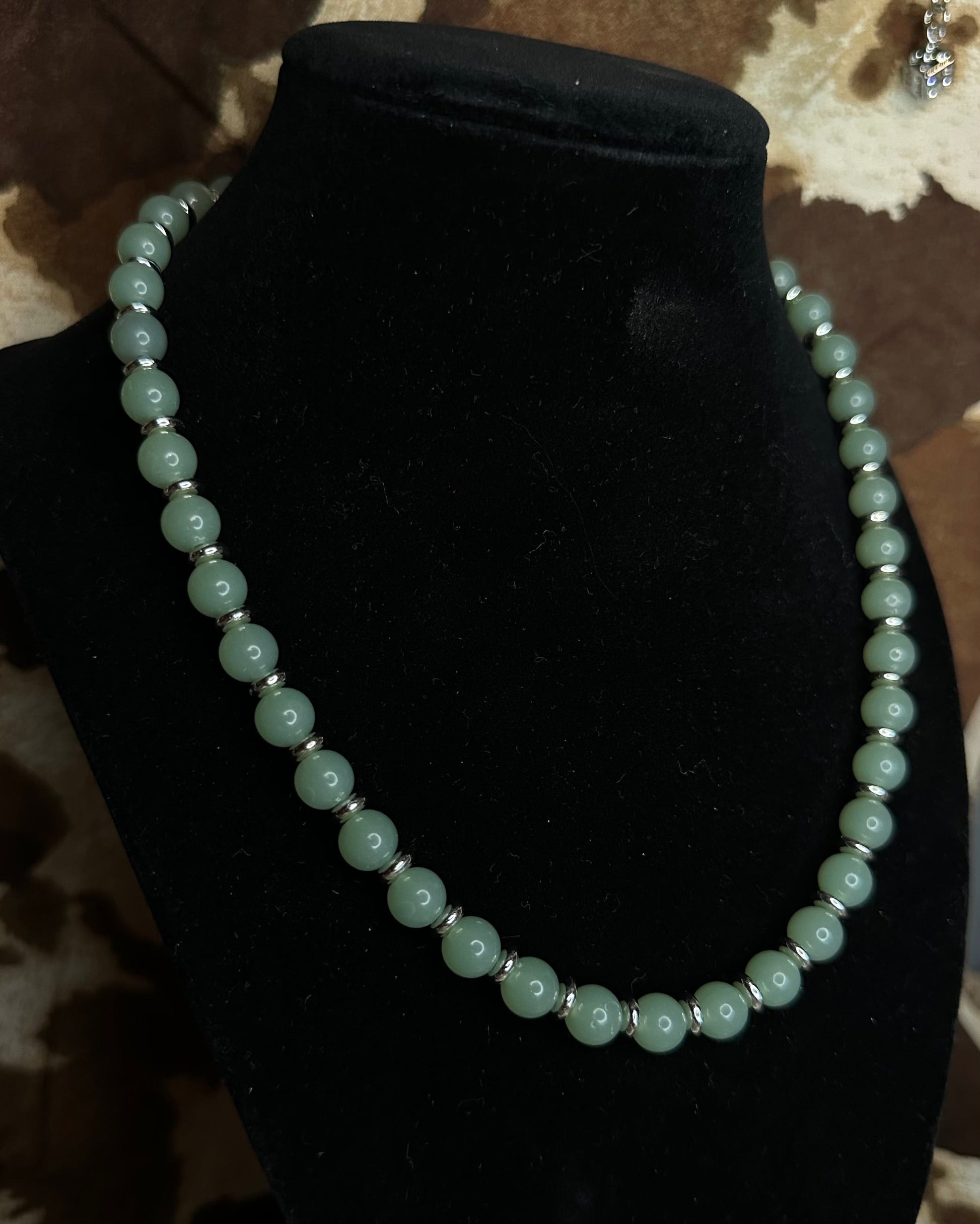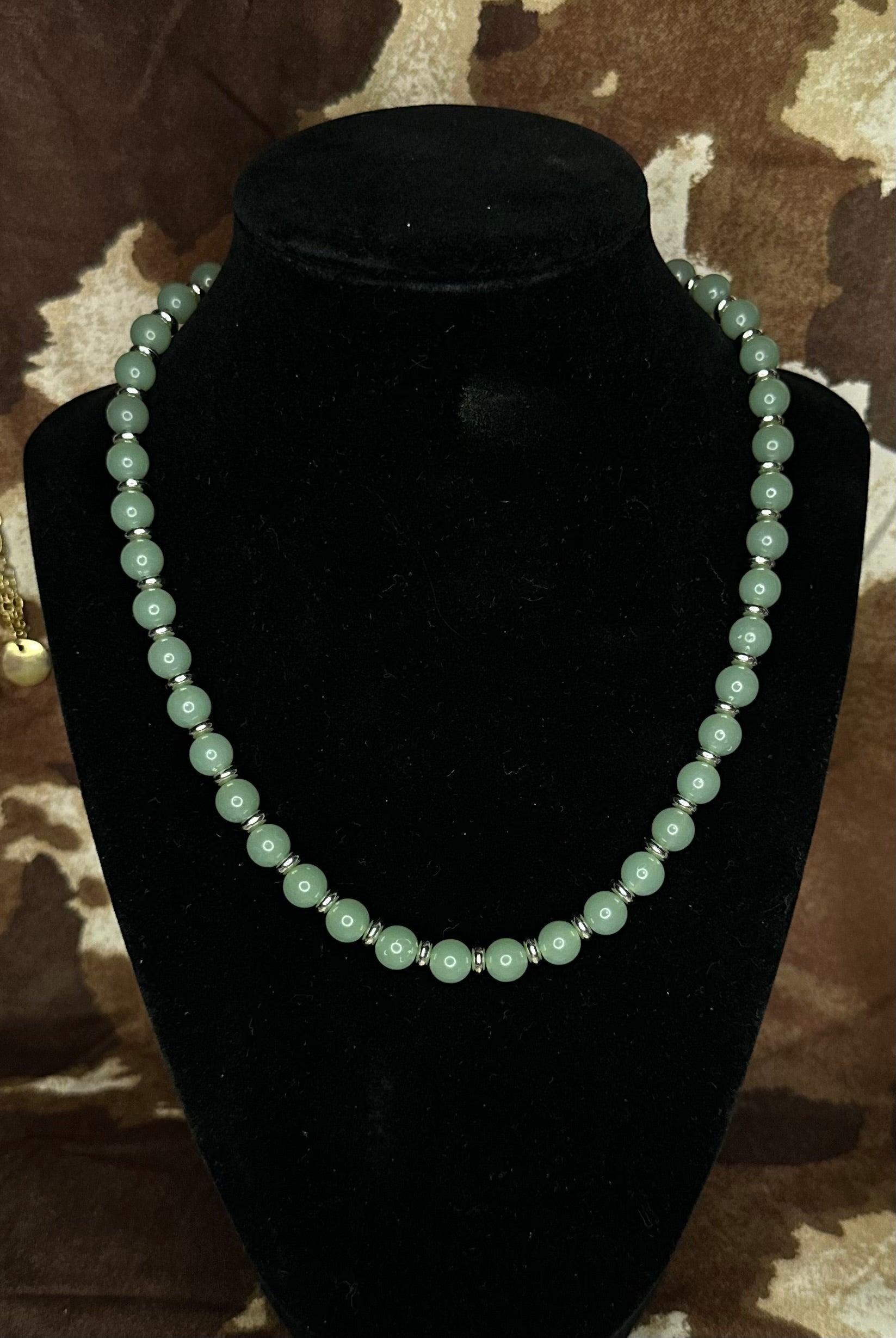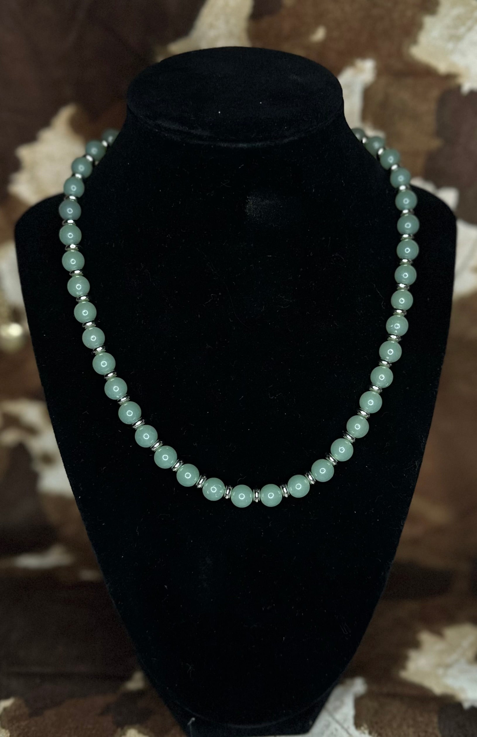 Grounded in calm, cool tones and handmade with care, the Saddle Sage necklace brings rustic elegance to your everyday look. Featuring smooth sage green beads separated by silver-toned spacers and finished with a secure silver lobster clasp, this piece rides the line between classic western and refined charm.
