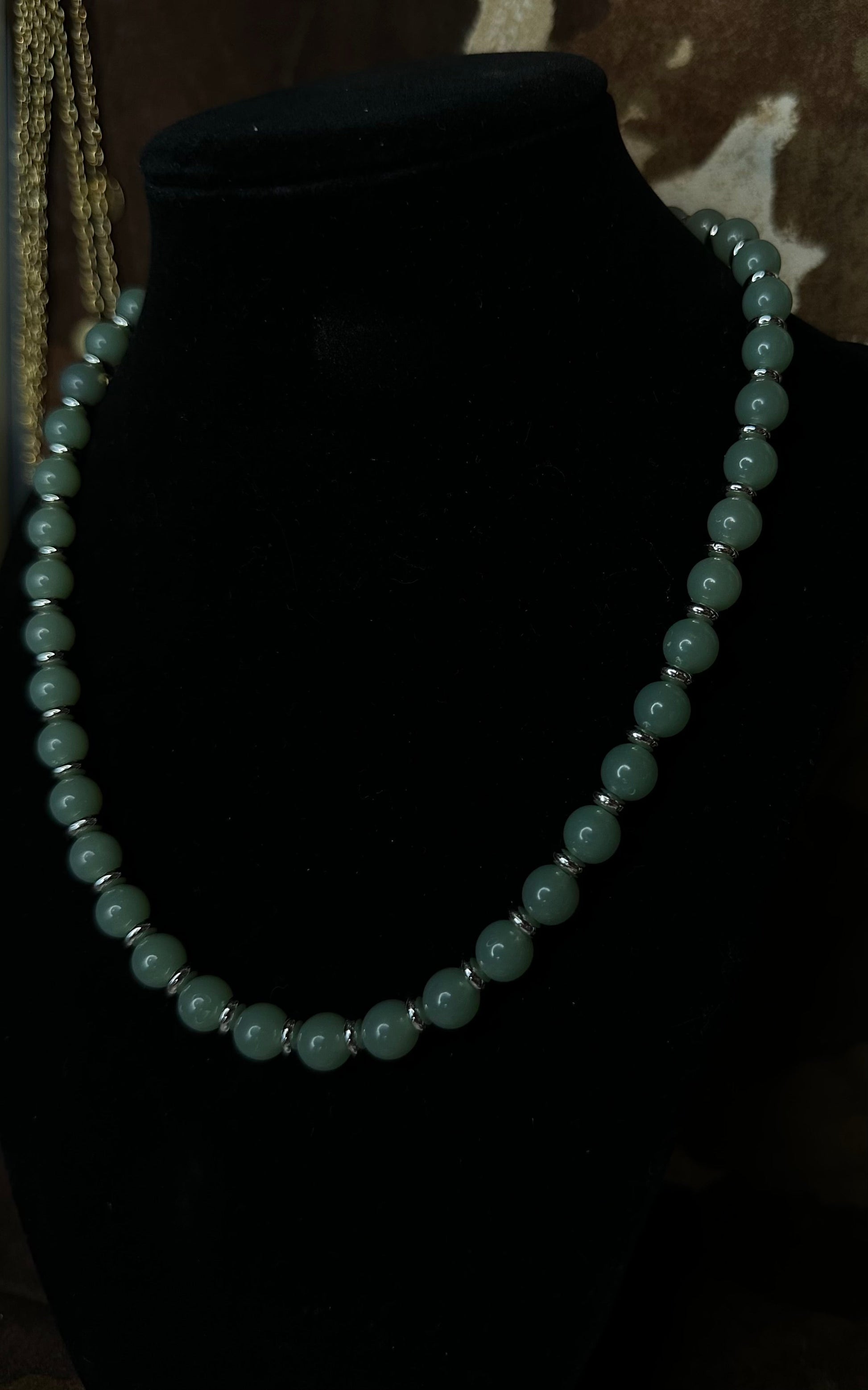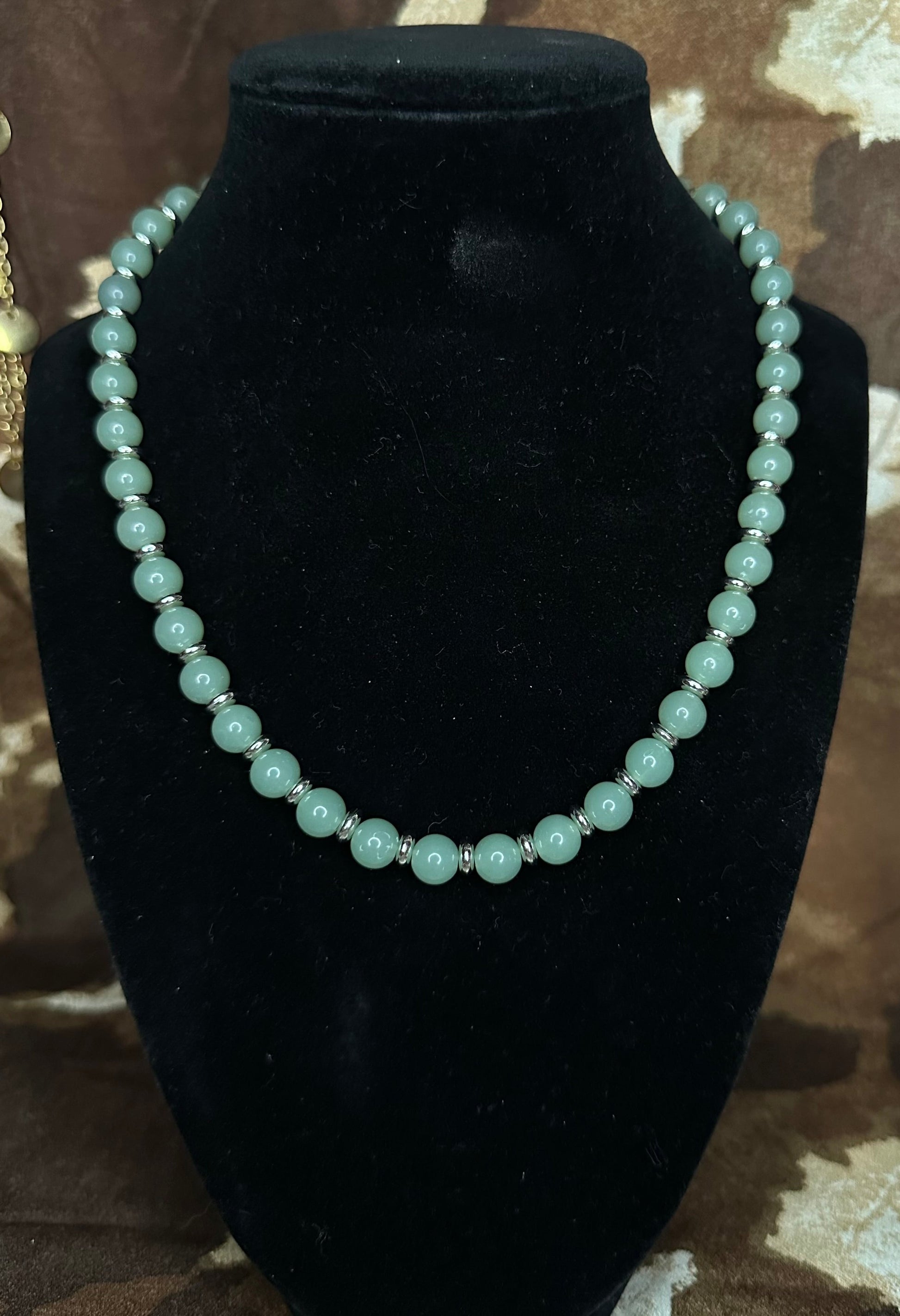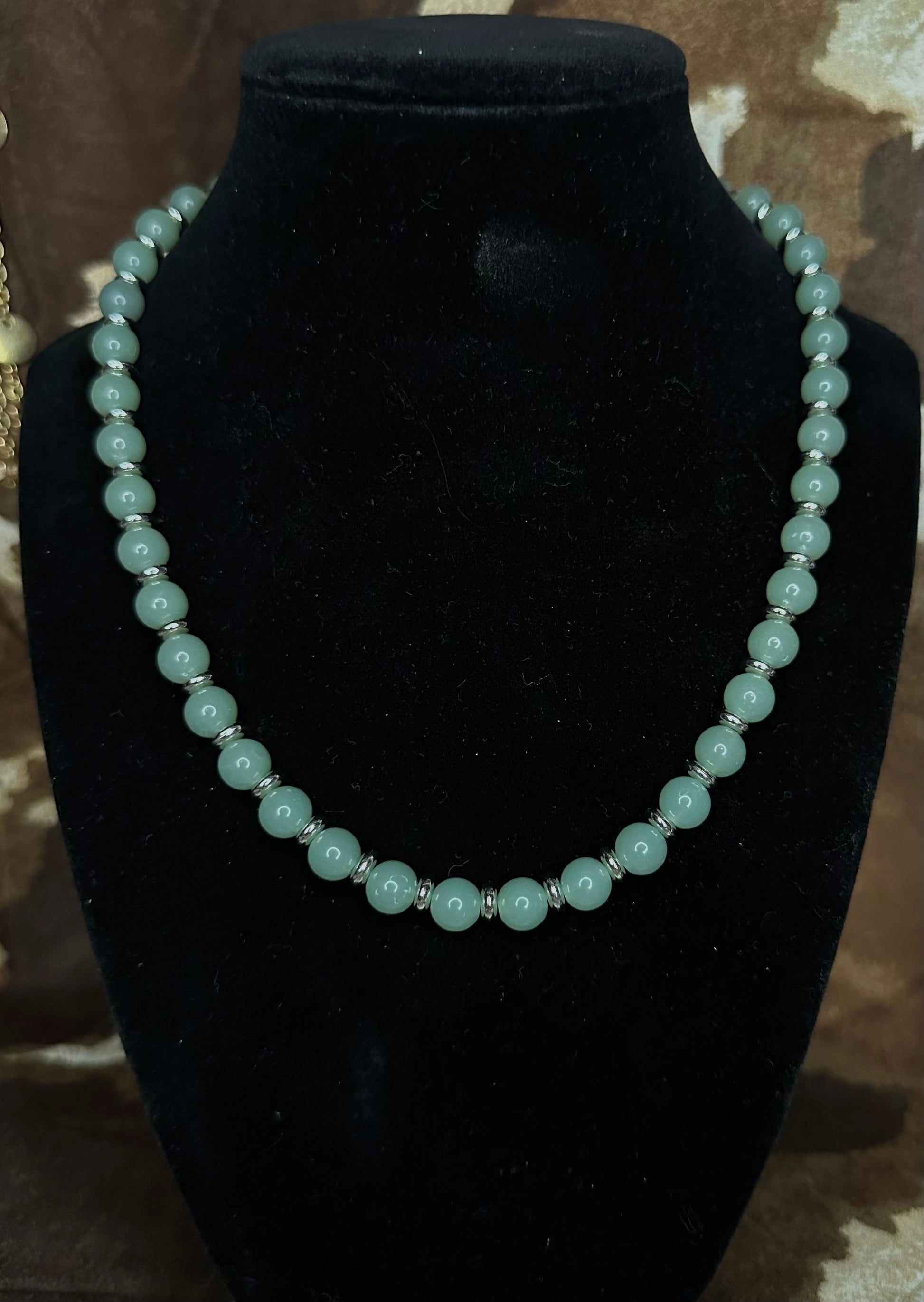 Grounded in calm, cool tones and handmade with care, the Saddle Sage necklace brings rustic elegance to your everyday look. Featuring smooth sage green beads separated by silver-toned spacers and finished with a secure silver lobster clasp, this piece rides the line between classic western and refined charm.