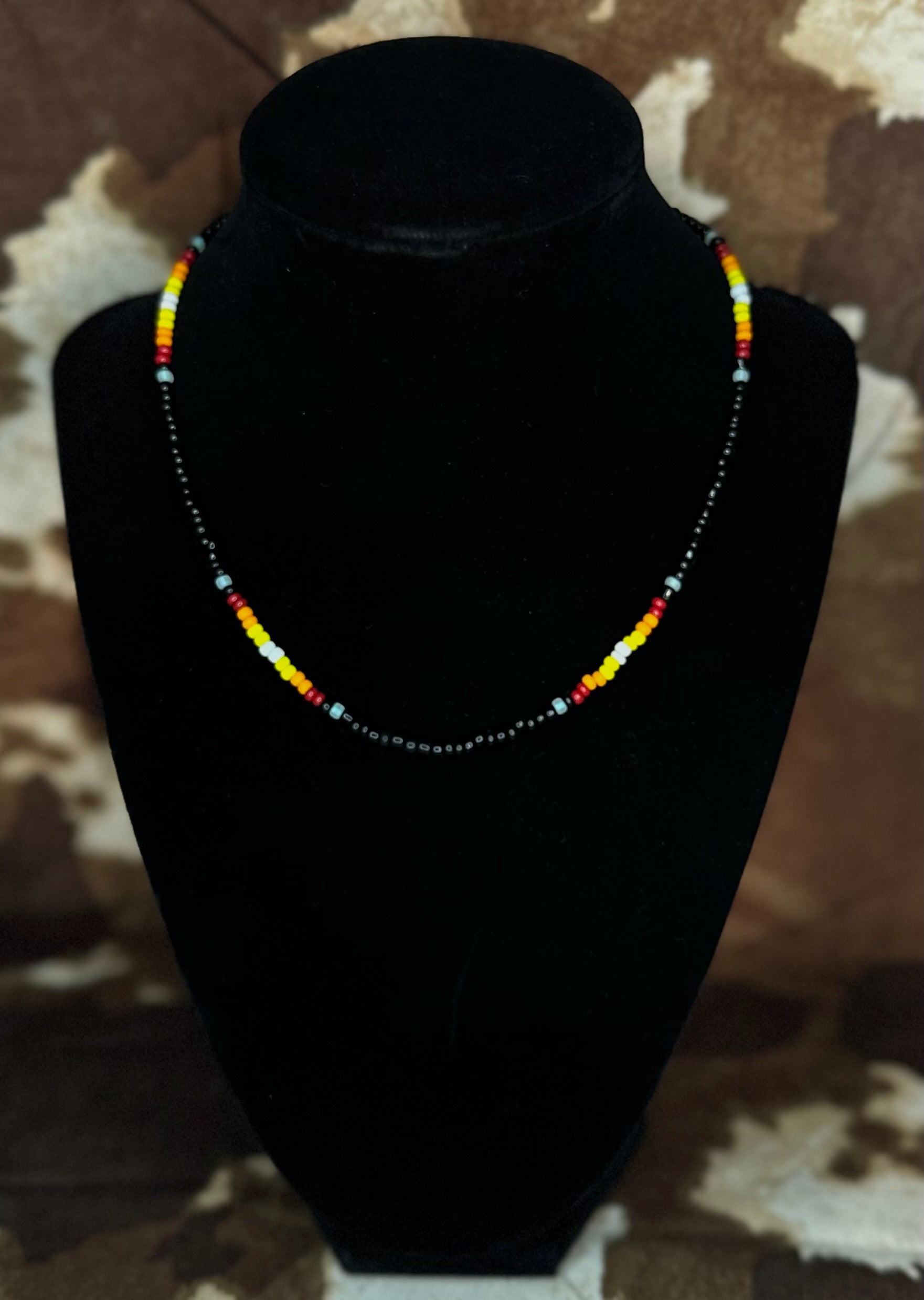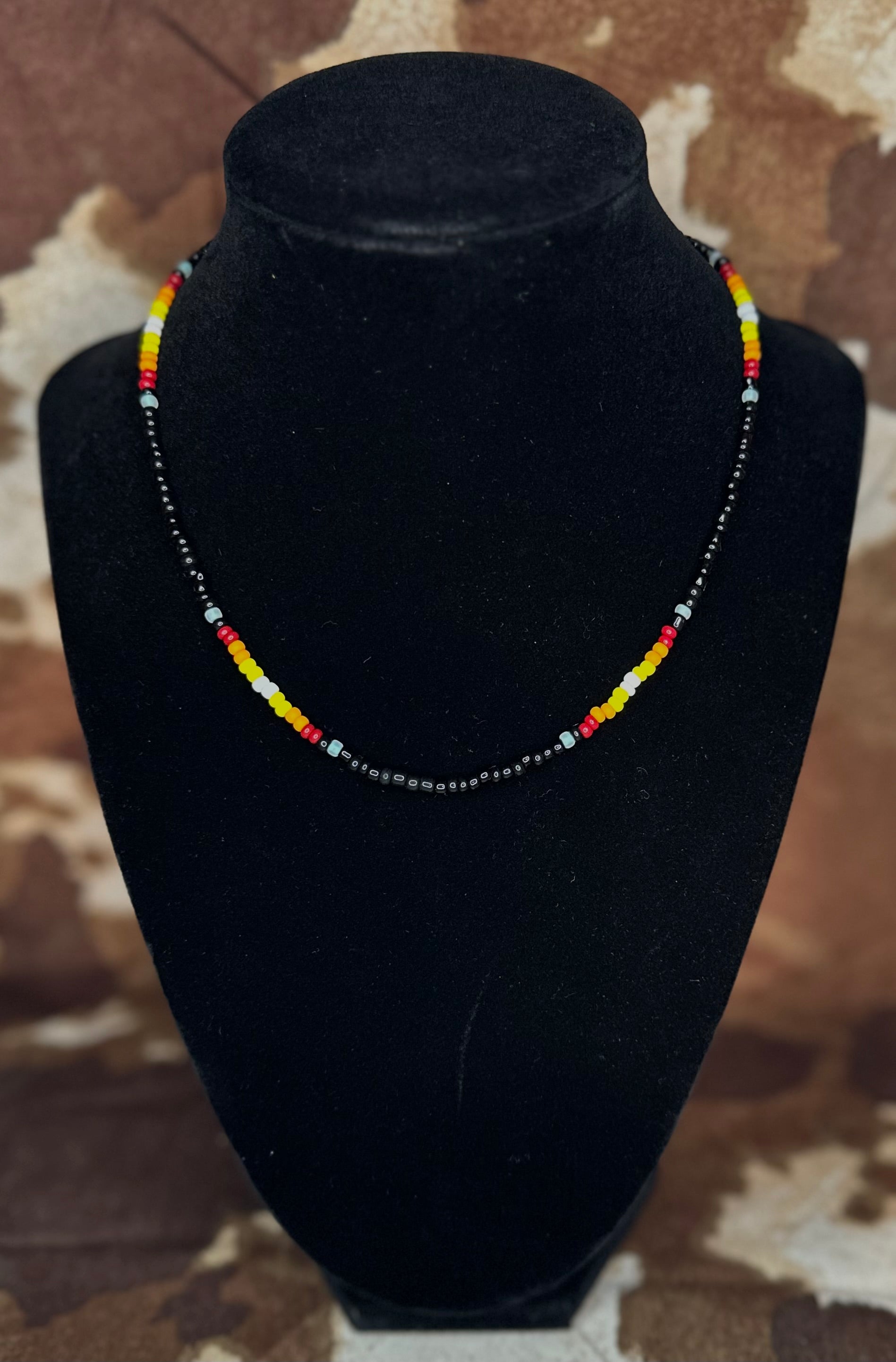 Elevate your look with the Sunlit Trails choker, a stunning blend of minimalist elegance and vibrant color. This handmade necklace features sleek black seed beads that frame a cascading pattern of warm sunset hues, creating a radiant focal point around your neckline. Crafted with care, it includes an extender chain and lobster clasp for a customizable, comfortable fit—perfect for layering or wearing solo as a statement piece. Add a touch of sunset-inspired beauty to any outfit with this versatile, handcrafted choker.