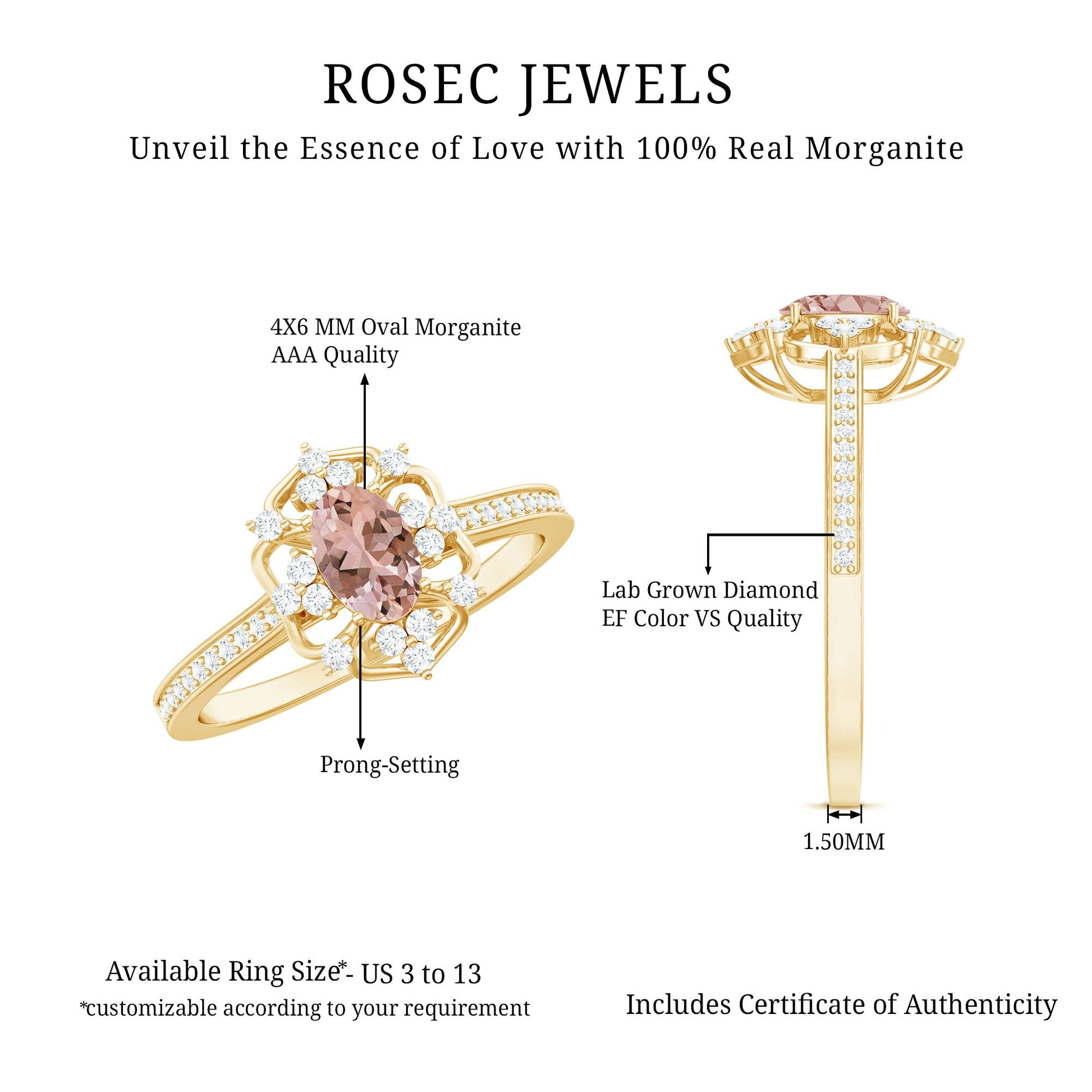 Made to capture the beauty of a bygone era, this Vintage Morganite Engagement Ring adds an antique touch to your love story. Made from Yellow Gold Plated Silver, this Floral Engagement Ring features a 4X6 MM oval shaped Morganite at its center, held securely in prong setting. Surrounding the center stone is a unique floral inspired frame, beautifully detailed to give the Vintage Looking Engagement Ring a charming, antique feel. The floral design is brought to life with sparkling round lab grown diamonds, adding brilliance and elegance from every angle. To enhance the beauty even further, the band is lined with round brilliant cut lab grown diamond side stones that shimmer with every movement. This Oval Engagement Ring blends classic charm with modern craftsmanship. Its vintage and antique inspired style is perfect for those who love delicate details, soft colors, and romantic designs. Perfect for the modern bride who appreciates old world romance, this Morganite and Diamond Ring is not only eye-catching but also meaningful. It comes with a jewelry box and a certificate of authenticity, ensuring that your moment is as perfect as the ring itself.